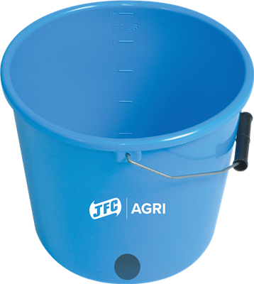 Our Blue 1.25 gallon bucket is high quality plastic and fitted with a strong metal handle. It is lightweight and easy to carry. When bored, the bucket accepts the JFC white teats and valves (CTC) sets for easy calf feeding.
